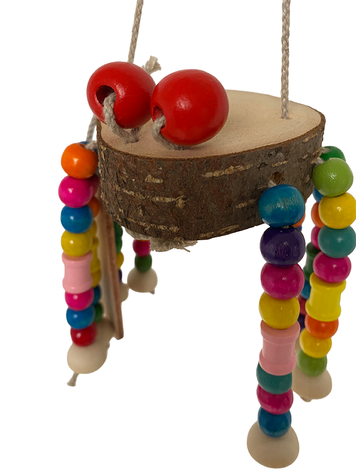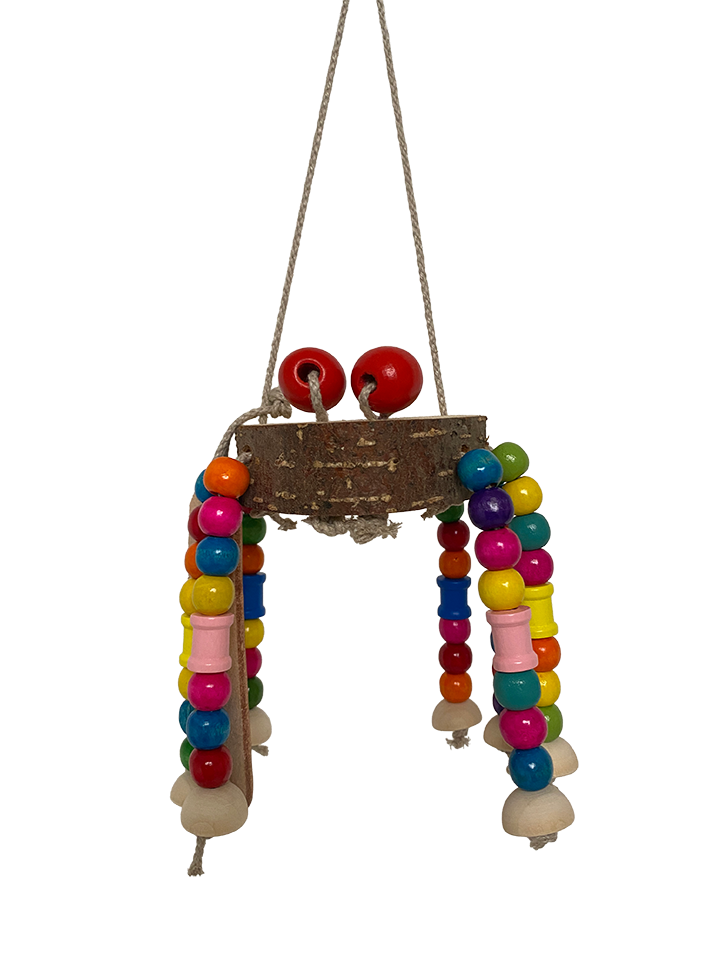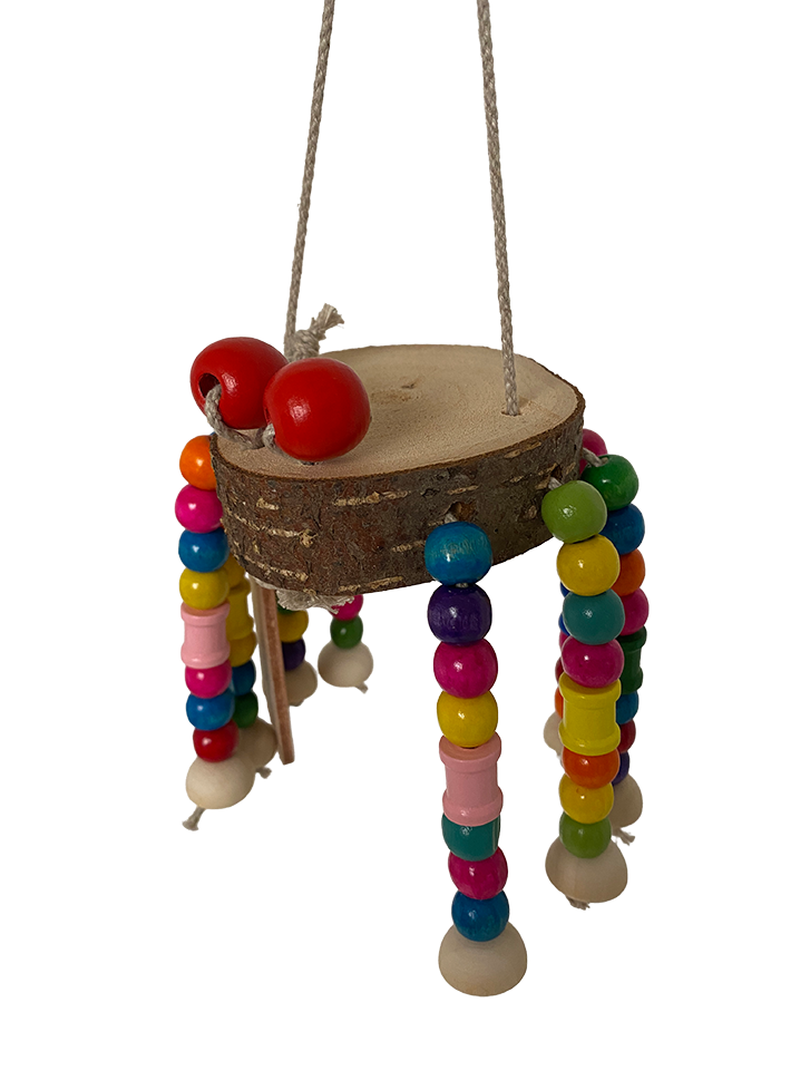 Breng het avontuur naar de kooi met onze Vogelspin, een verrassend en speels hangend speeltje dat perfect is voor papegaaien die graag ontdekken, slopen en bewegen. Dit handgemaakte speeltje is opgebouwd uit verschillende structuren en materialen, zodat jouw vogel telkens weer iets nieuws kan onderzoeken. De vrolijke ‘spin’ nodigt uit om te trekken, tikken en knagen.